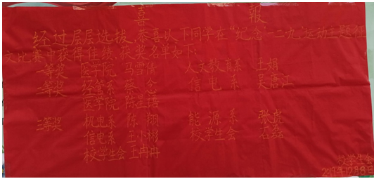 我系举办这次活动的目的是为了纪念“一二·九”运动84周年,发扬“一二·九”运动的光荣传统,缅怀革命先辈的爱国情怀,进一步激发当代青年学生奋发图强、积极进取、报效祖国的热情。恭喜我系18计算机一班吴唐江荣获二等奖及18计算机一班王小彬同学荣获三等奖。