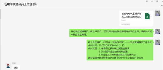为夯实就业工作基础,系统推进我院2022届毕业生就业工作,按照学校就业工作部署安排,并结合教育部、省教育厅以及学校关于《2022 届高校毕业生就业促进周活动方案》的相关通知要求,5月9日中午12:15,智能与电气工程学院召开了2022届毕业班辅导员就业工作线上会议。2022届全体毕业班辅导员及学院负责就业工作相关老师参加会议,会议由学院党支部书记吴访主持。