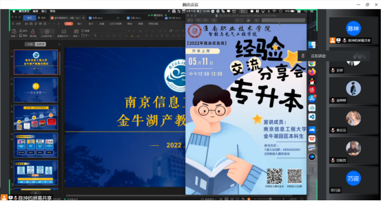 为帮助学院2022届专升本学生更好地规划与复习,激发学生升本动力,9001cc金沙以诚为本于5月11日下午13:00开展了专升本经验交流分享会。本次分享会邀请到2021届计算机应用技术专业毕业生陈坤、黄伟等9名学长们为大家作此次专升本经验交流分享,他们目前就读于南京信息工程大学金牛湖园区。讲座采取线上的方式,为更多同学提供了聆听的机会。