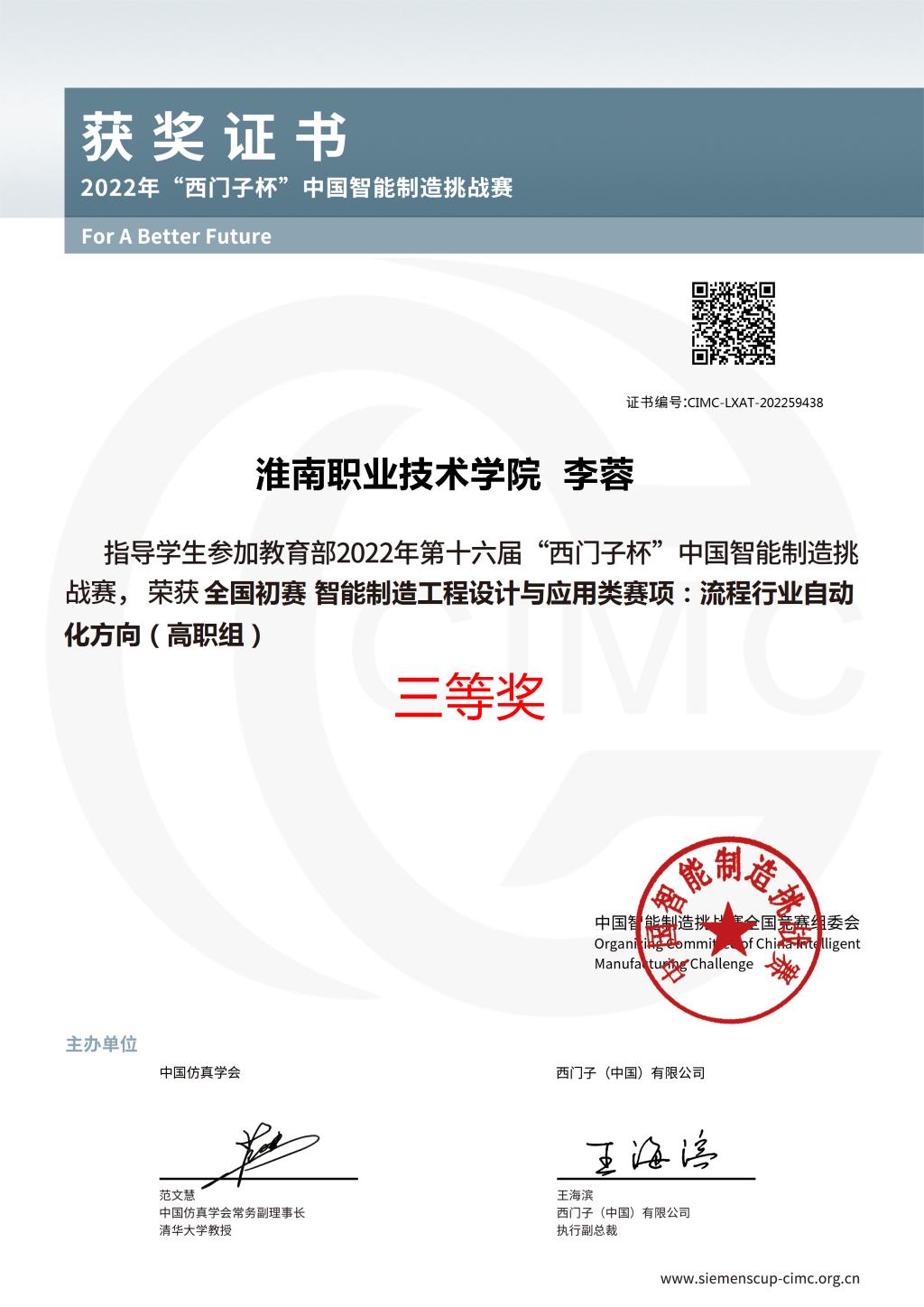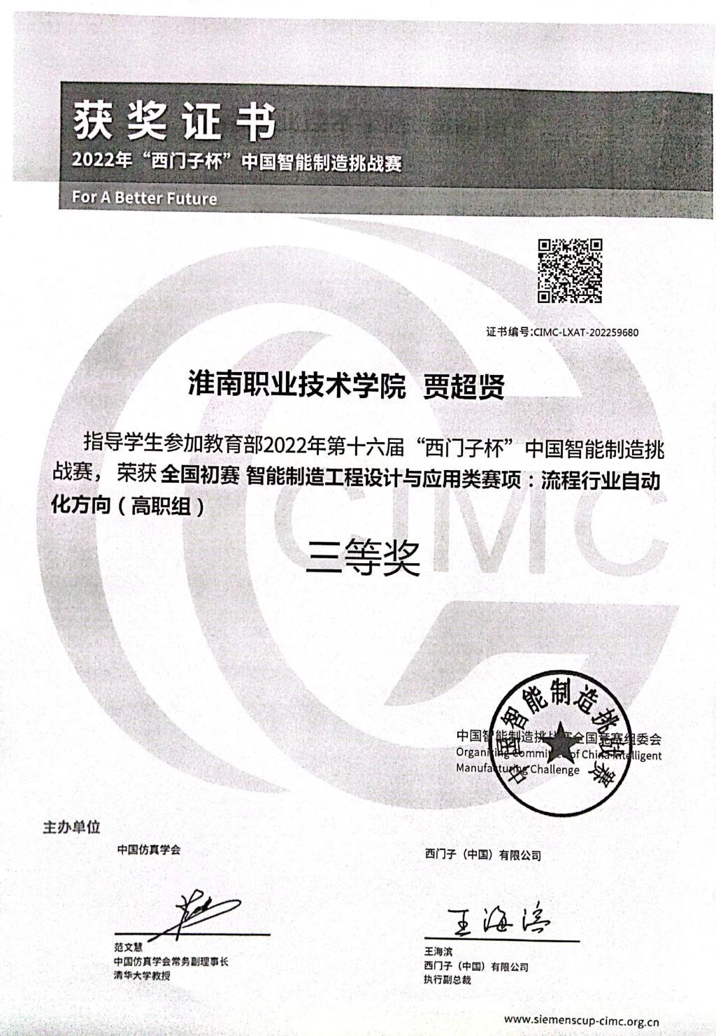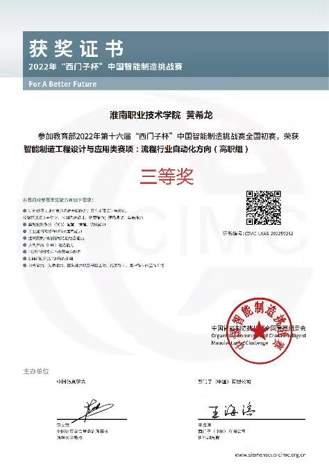 教育部2022年CIMC“西门子杯”中国智能制造挑战赛落下帷幕,我校9001cc金沙以诚为本教师贾超贤、李蓉指导黄希龙同学组成的参赛队伍获得三等奖。CIMC“西门子杯”中国智能制造挑战赛是全国智能制造领域规模最大、规格最高的国家A类竞赛,是教育部认定的大学生学科竞赛之一。挑战赛以面向工程,追求卓越为指导,旨在促进高等学校的工程实践能力教育,是展示各院校智能制造领域高水平应用教育的重要赛事。