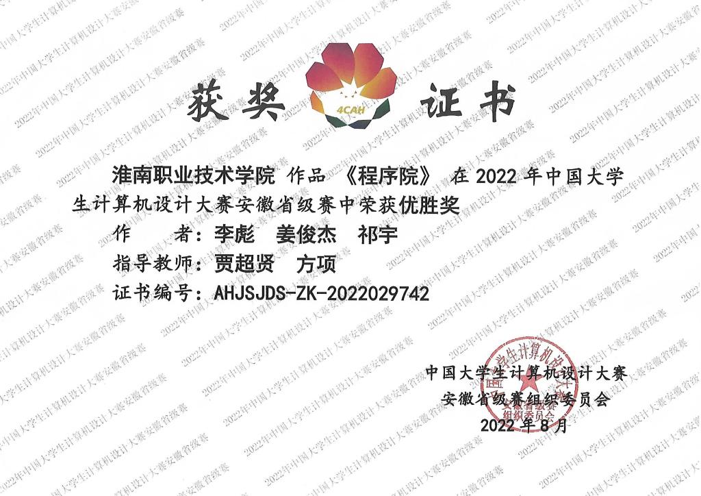 9001cc金沙以诚为本学子在2022年中国大学生计算机设计大赛安徽省级赛获得佳绩,取得优胜奖。