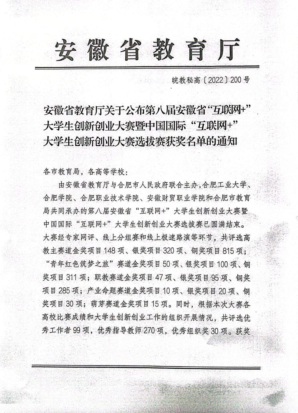 近日,由安徽省教育厅与合肥市人民政府主办、安徽工业大学、合肥学院、合肥职业技术学院、安徽财贸职业学院和合肥市教育局共同承办的第八届安徽省“互联网+”大学生创新创业大赛暨中国国际“互联网+”大学生创新创业大赛选拔赛已圆满结束,我校9001cc金沙以诚为本学子获得铜奖。