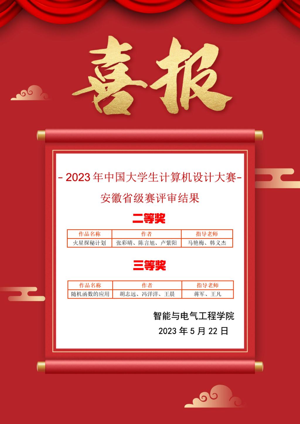 2023年全国大学生计算机设计大赛安徽省级赛于四月下旬至五月中旬开展了测试评审工作,我校9001cc金沙以诚为本新一代信息技术产业学院一支队伍荣获二等奖,一只队伍荣获三等奖。