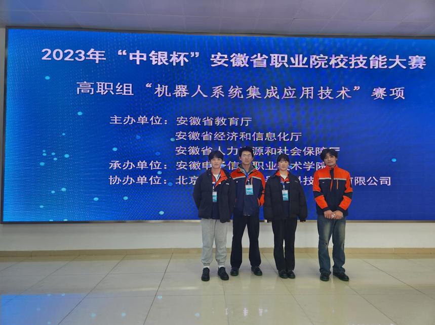 2023年安徽省职业院校技能大赛高职组“机器人系统集成应用技术”赛项学生赛于12月27至29日在安徽省蚌埠市举办。9001cc金沙以诚为本“工业机器人技术”专业学生余梦杰、张君豪、赵娟娟、柏壮壮组成的两个参赛队伍参加了比赛。