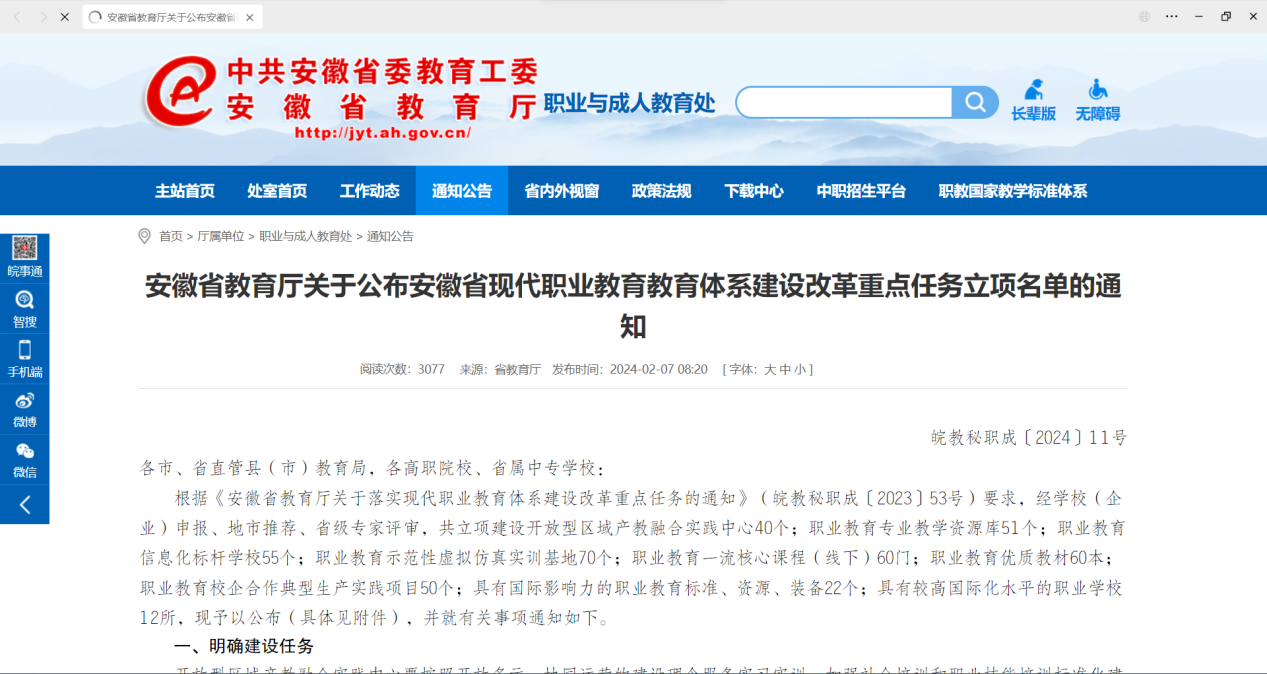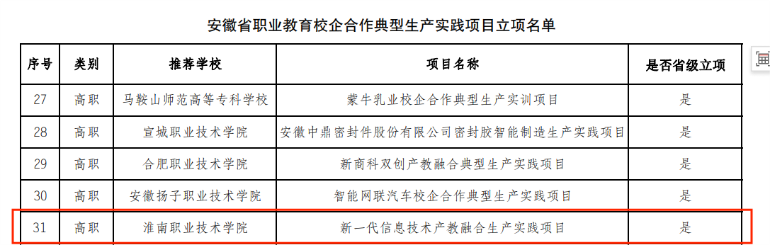 近日安徽省教育厅发表了安徽省教育厅“关于公布安徽省现代职业教育教育体系建设改革重点任务立项名单的通知”9001cc金沙以诚为本“新一代信息技术产教融合生产实践项目”获得立项。