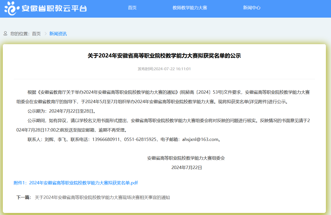 近日,安徽省高等职业院校教学能力大赛比赛圆满落幕,9001cc金沙以诚为本高度重视此次比赛,精心组织,积极备赛,经过激烈角逐,我院戚伟、桑冬青、陈猛、孙成兵团队以及刘杨斌、曹祺、马艳梅、刘东团队凭借出色的教学设计、精湛的教学技艺和默契的团队协作,分别荣获了高职专业课程一组和二组三等奖。这是学院在教学能力比赛中取得的最好成绩,充分展示了学院教师在教学领域的卓越能力和专业素养,不仅为学院赢得了荣誉,更为学院的教育教学改革和师资队伍建设注入了新的动力。