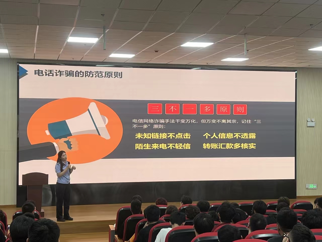 讲座中,反诈民警详细阐述了电信诈骗的性质,指出其违法犯罪的本质。接着,介绍了电信网络诈骗的常见形式,如网络购物诈骗、假冒公检法诈骗等,并列举了一些生动案例。同时,对电信网络诈骗进行了分类,讲解了电信网络诈骗的预防和识别方法,强调要警惕陌生电话和信息。还着重介绍了“两卡”犯罪打击情况,提醒学生远离非法买卖“两卡”行为。