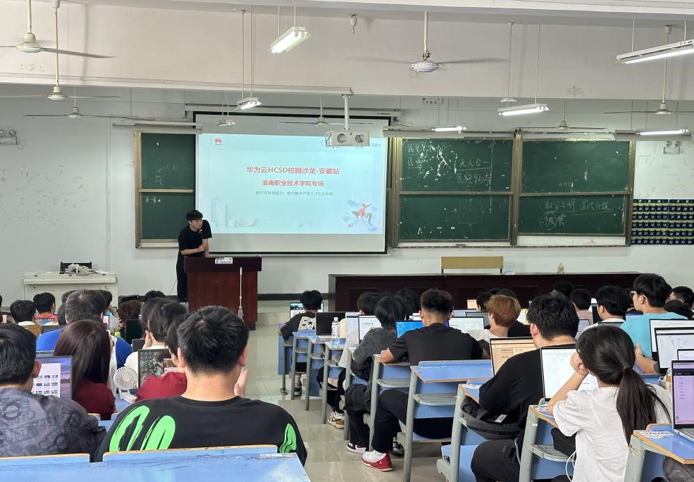 2023年6月2日在一号教学楼1215举行了“华为云HCSD校园沙龙”走进淮南职业技术学院讲座。本次活动由淮南职业技术学院王凡老师主持,介绍人为讯方技术许阳老师。华为云—AI共话行业技术、勇攀技术高峰,共建高校生态,助力院校人才培养。计算机应用技术和大数据技术全体学生参加了此次讲座。