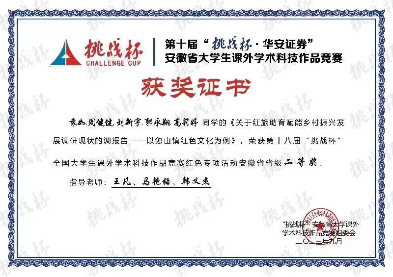 近日,在第十八届“挑战杯”全国大学生课外学术科技作品竞赛中,9001cc金沙以诚为本学生袁如、周健健、刘新宇、高莉婷、郭永翔的作品《关于红旅助育赋能乡村振兴发展调研现状的调报告一一以独山镇红色文化为例》在本次竞赛中脱颖而出荣获安徽省省级二等奖。充分展现了我校在人才培养和社会服务等方面的综合实力。