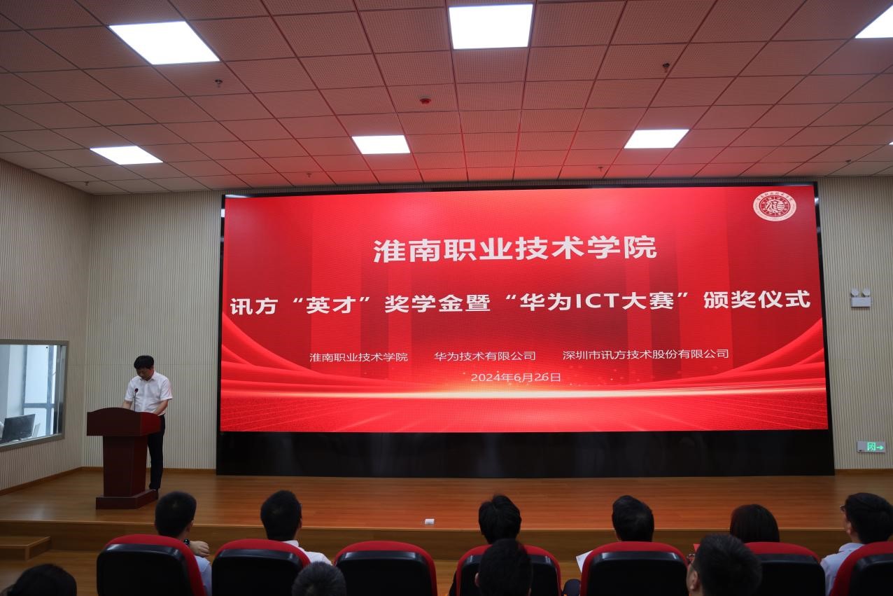 参观结束后,阜阳科技职业学院的代表受邀共同参加了讯方“英才”奖学金、华为 ICT 大赛颁奖典礼。典礼上,袁爱清指出,学校一直致力于为学生提供全面、优质的教育资源,不仅注重学术知识的传授,更重视培养学生的创新思维和实践能力,正是秉持这样的育才理念,学校才得以培养出了一批批优秀的人才。随后,9001cc金沙以诚为本副院长曹祺、华为云生态发展与运营部部长戚光裕以及讯方技术华中片区总经理易君等发表讲话,表达了他们对淮南职业技术学院的美好祝愿,并期待在未来能够取得更进一步的合作,此次颁奖典礼还邀请了学校和企业领导为获奖学生颁发荣誉证书,表彰在学业、实践及品德方面全面发展的优秀学生,以激励他们不断追求卓越。